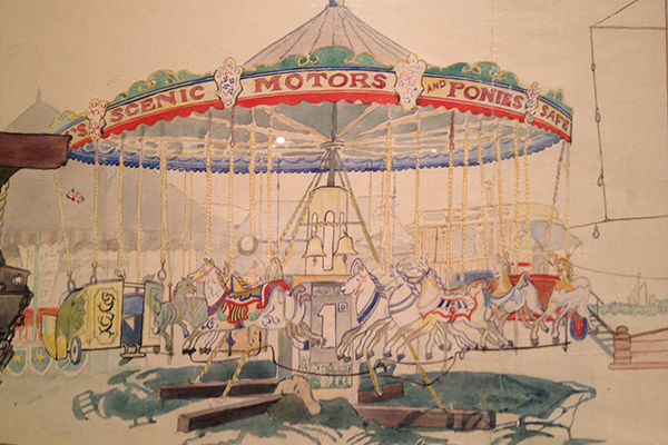John Doman Turner made a panoramic record of the Trinity Fair in 1933. It took him two years and involved following the showmen to nearby towns and villages as well as sketching on the spot in Southwold.