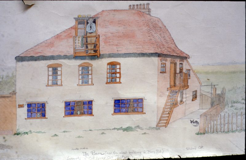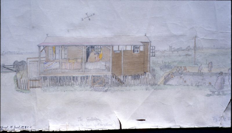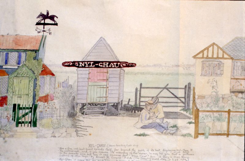 ‘In 1930 Doman Turner had performed a practice run (of the Walberswick Scroll) by painting a much smaller scrolls depicting the rambling and high individual beach houses along Ferry Road, Southwold. Many of those buildings were lost in the 1953 flood. Included on this scroll, but also long vanished, was the artists own summer residence, a caravan parted from its wheels, mounted on a solid plinth and named Jane, after a lady friend.’
