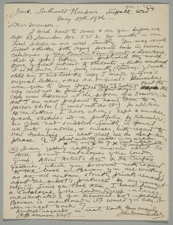 You can see that Turner sent written correspondence from this address ‘Jane, Southwold Harbour, Suffolk’, to James Bolivar Manson in 1936.