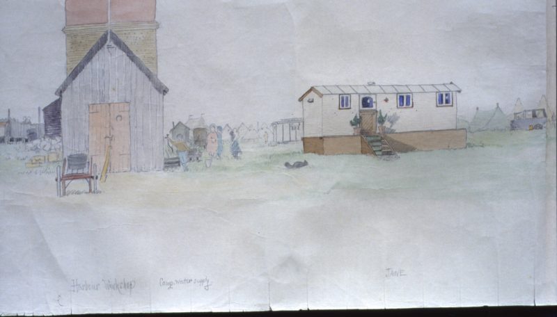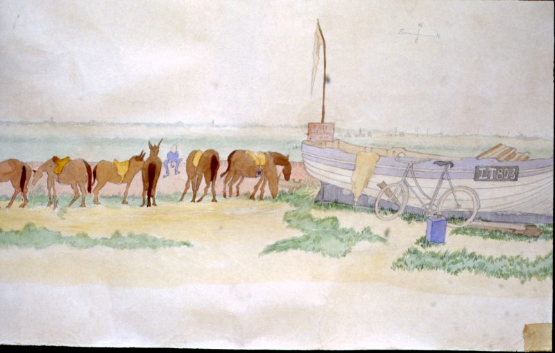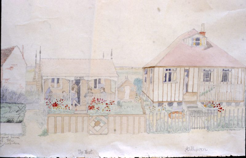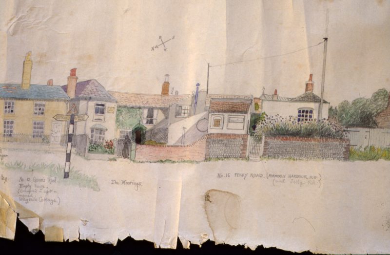 Turner did not attempt to portray the whole of Southwold; he confined himself to Ferry Road, a part he found particularly quirky and interesting. In 1930 it was notable for its line of unusual beach chalets, no two alike, running the length of the road and backing onto Southwold marsh. A few of these survive, albeit rather altered over time, but a number of them, particularly those closest to the river, were washed away in the devastating tidal surge in January 1953, in which several lives were lost.”